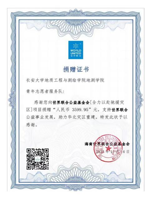 受台风“杜苏芮”影响,华北地区在7、8月遭受严重汛灾。地测青年志愿服务队积极响应国家号召,第一时间联系基金会,组织全校开展爱心募捐活动,为受灾的华北灾区提供援助。在各方的努力下,此次募捐活动共有1833人参加,共计捐款9571.71元,为华北地区的灾后重建工作提供了实实在在的支持和帮助,获得了两基金会颁布的捐赠证书,为社会贡献出了一份长大力量。