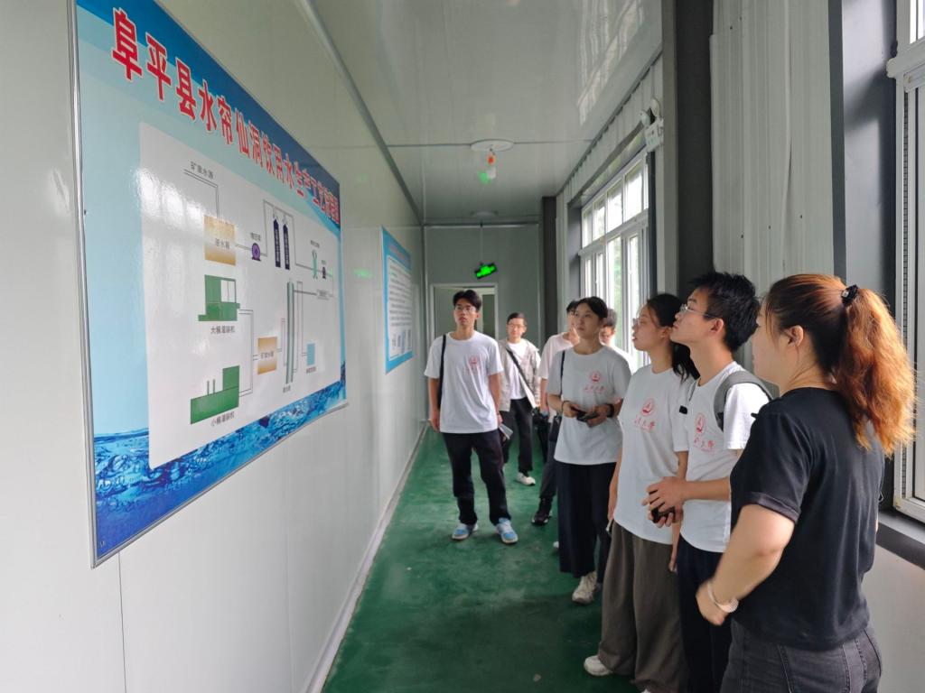 当日上午,实践队来到阜平县水帘仙洞饮用水有限公司。公司在筹备阶段受到中央军委国防动员部、浙江省军区、各级政府的关注和支持。浙江奉化区滕头村捐赠注册基金300万,店房村11名村民占股11万,是店房村首个村集体产业。成员们在厂区负责人的带领下参观了工厂的生产线并进行座谈。在参观过程中了解到,阜平县店房村地处太行山西部太行深山区。其优越的生态资源,为山泉水净化提供了得天独厚的环境。除了正常桶装水、定制水与饮用天然山泉水,公司还推出了分装式蜂蜜水等特色饮品。随后,队员们在访谈中了解到,公司以自然资源为支撑,坚持优势变胜势,资源变效益,实现村集体经济和村民收入双丰收。实践队员们深刻领悟到,推动乡村振兴必须要用好一方水土,开发乡土资源,以“土特产”产业持续推动乡村振兴。
