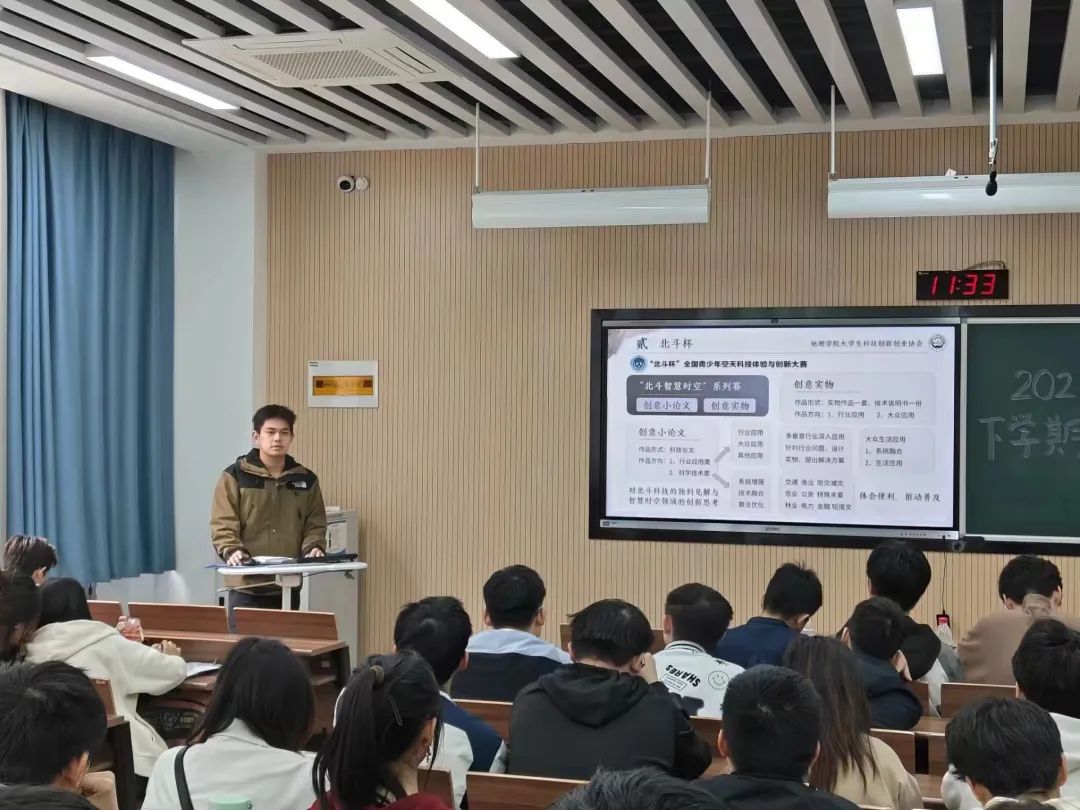 其中,在涉及到“北斗杯”全国大学生科技体验与创新大赛时,实践部负责人吴奕凡作为“北斗杯”省级三等奖获得者,精心分享了他的比赛经验。他指出“北斗杯”比赛的可参与度较高,很多项目都可以与北斗结合,同时他着重强调了创意实物赛道的重点在于产品说明书及产品本身,获奖难度相对较小,鼓励大家积极参加比赛,营造良好的参赛氛围。