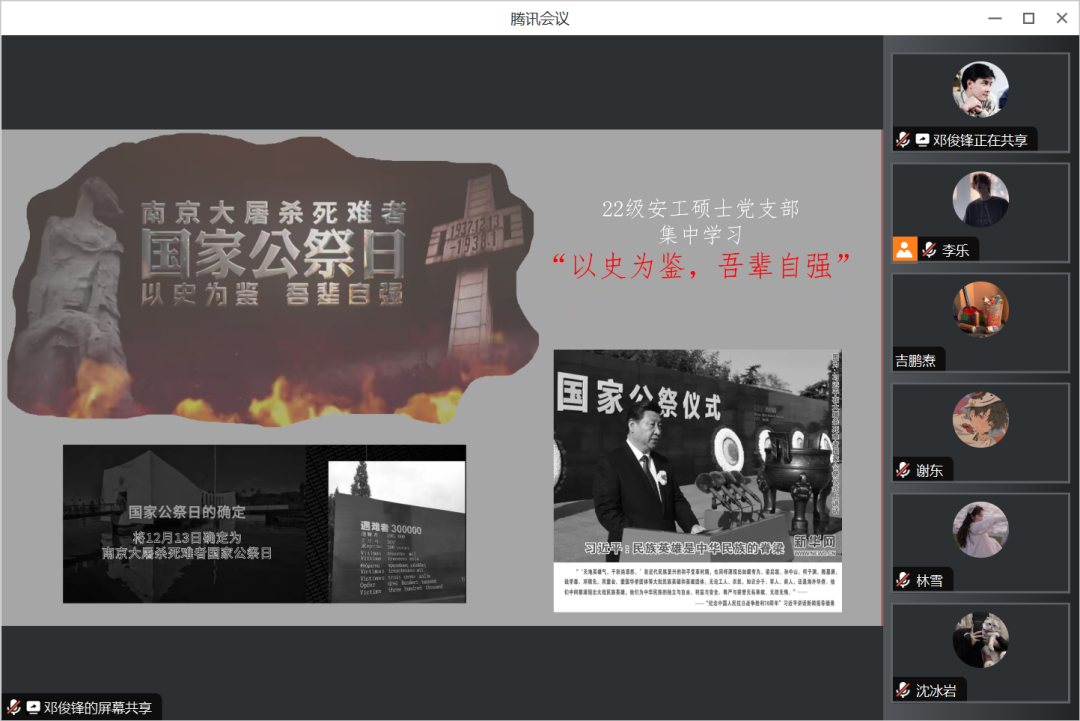 2023年12月13日是第十个南京大屠杀死难者国家公祭日。86年前的今天,侵华日军野蛮侵入南京,制造了惨绝人寰的南京大屠杀,30多万同胞惨遭杀戮,三分之一建筑被毁,大量财物遭到掠夺……对我们来说,这不仅是一段历史记忆,更是一次对和平的深刻思考和警醒。12月13日,世界杯体育官方网站2022级安工硕士党支部以“以史为鉴,吾辈自强---南京大屠杀死难者国家公祭日”为主题开展集中学习。