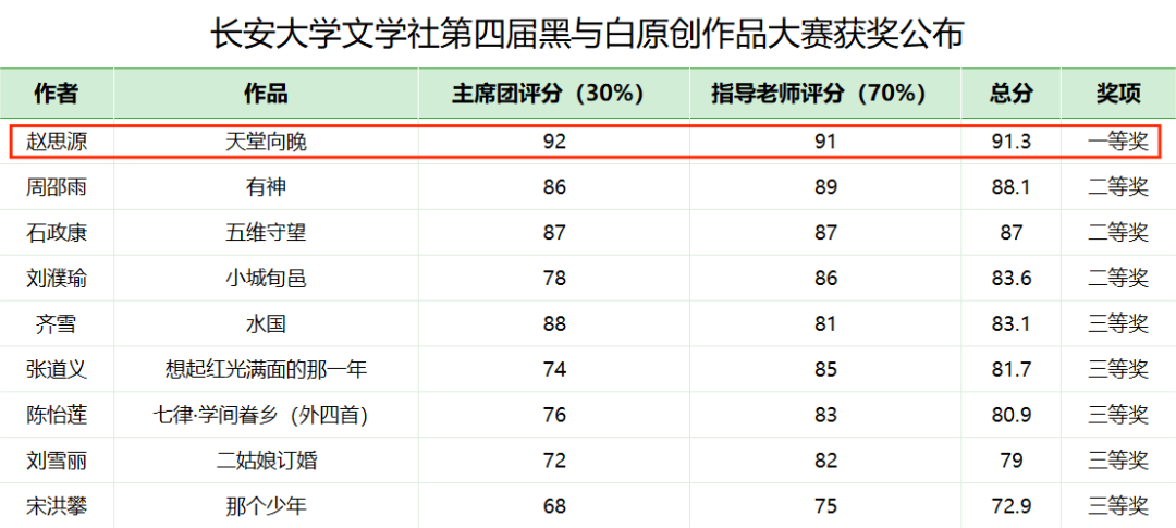 2022年6月,他的小说《风起月苋》荣获世界杯体育官方网站文学社第三届黑与白征文比赛全校一等奖(总分第一名),2023年6月,他的小说《天堂向晚》荣获世界杯体育官方网站文学社第四届黑与白征文比赛全校一等奖(总分第一名),成为该比赛自举办以来唯一一人蝉联冠军。