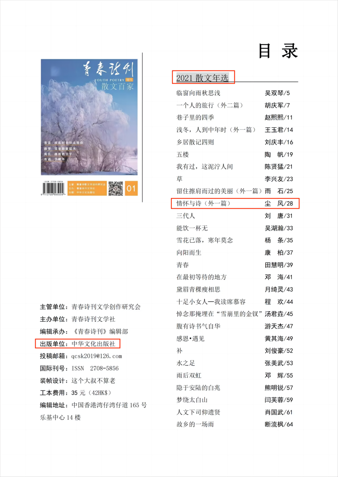 在见证现代诗在当代文坛的小有成功与肯定后,他继续磨砺着自己其他文学体裁的创作能力。2021年11月,他以笔名“尘风”发表散文《情怀与诗》《告白之夜》,凭借其标志性唯美细腻的文风入选《青春诗刊》“2021年度散文精选”,与多位大作家一同登刊,同时获赠其纸质刊物。笔下的文字与故事被美誉为“妖冶而不失素淡”“妩媚而不失纯洁”。