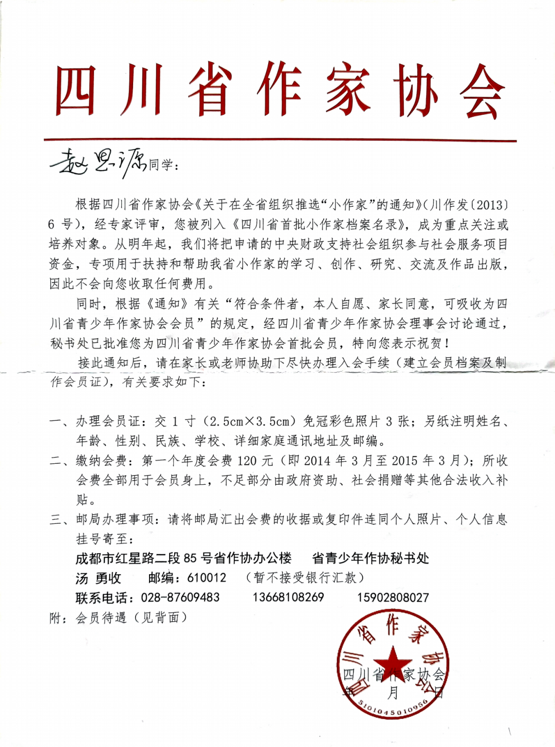 “字语心声,笔尖风雅”。谈及对艺术的热爱,生于书香门第的他从小便与文字结缘:4岁师从著名书法家黄伦先生;5岁开始主持校内外各类文艺活动;7岁开始写诗填词;10岁写下自己第一篇长篇小说(共计2万余字);12岁被列入《四川省首批小作家档案名录》;13岁受邀加入四川省青少年作家协会,成为首批会员;17岁获第五届“北大培文杯”四川省一等奖,并赴北京大学参加现场决赛,获全国三等奖……至此,一颗文学之星正在冉冉升起。