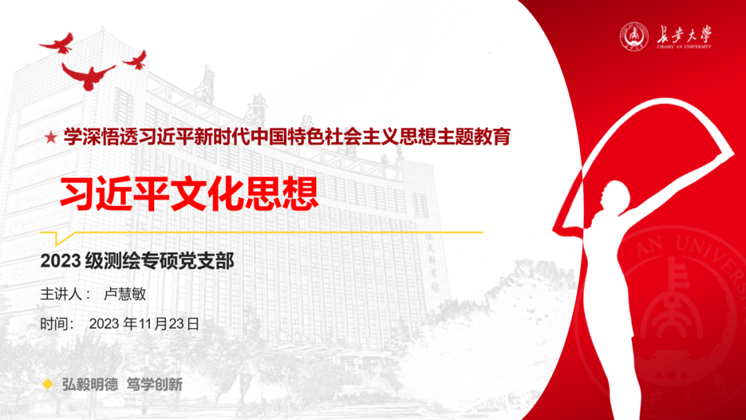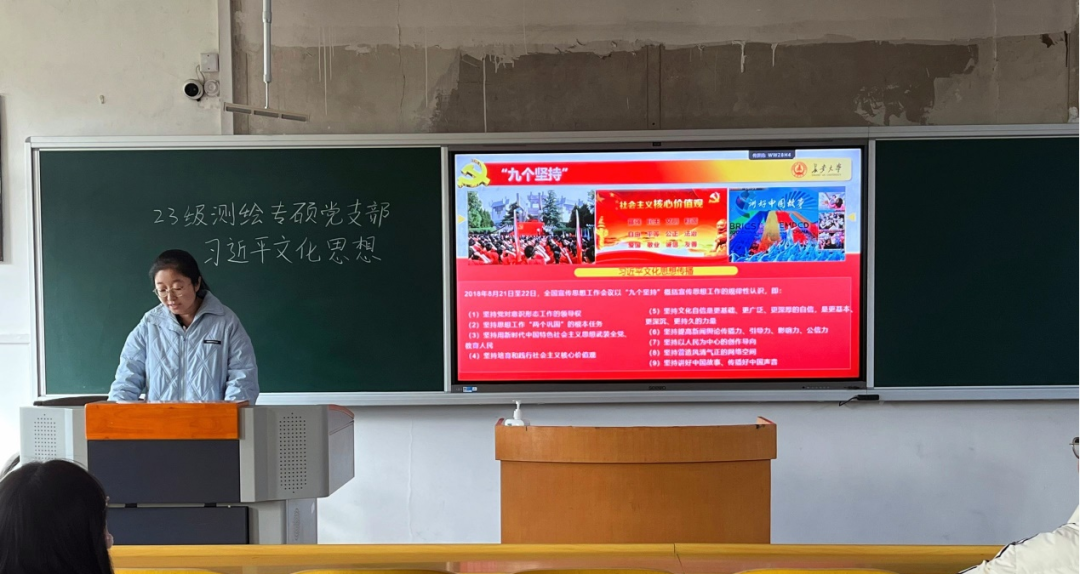 2023年10月7日至8日,全国宣传思想文化工作会议在北京召开。会议最重要的成果就是首次提出了习近平文化思想。习近平新时代中国特色社会主义思想的文化篇,在马克思主义中国化时代化进程中浓墨重彩、熠熠生辉。近日,世界杯体育官方网站2023级测绘专硕党支部以“习近平文化思想”为主题,进行针对性学习。此次主题学习由党支部书记卢慧敏同志进行讲解,全体党支部成员参与学习。