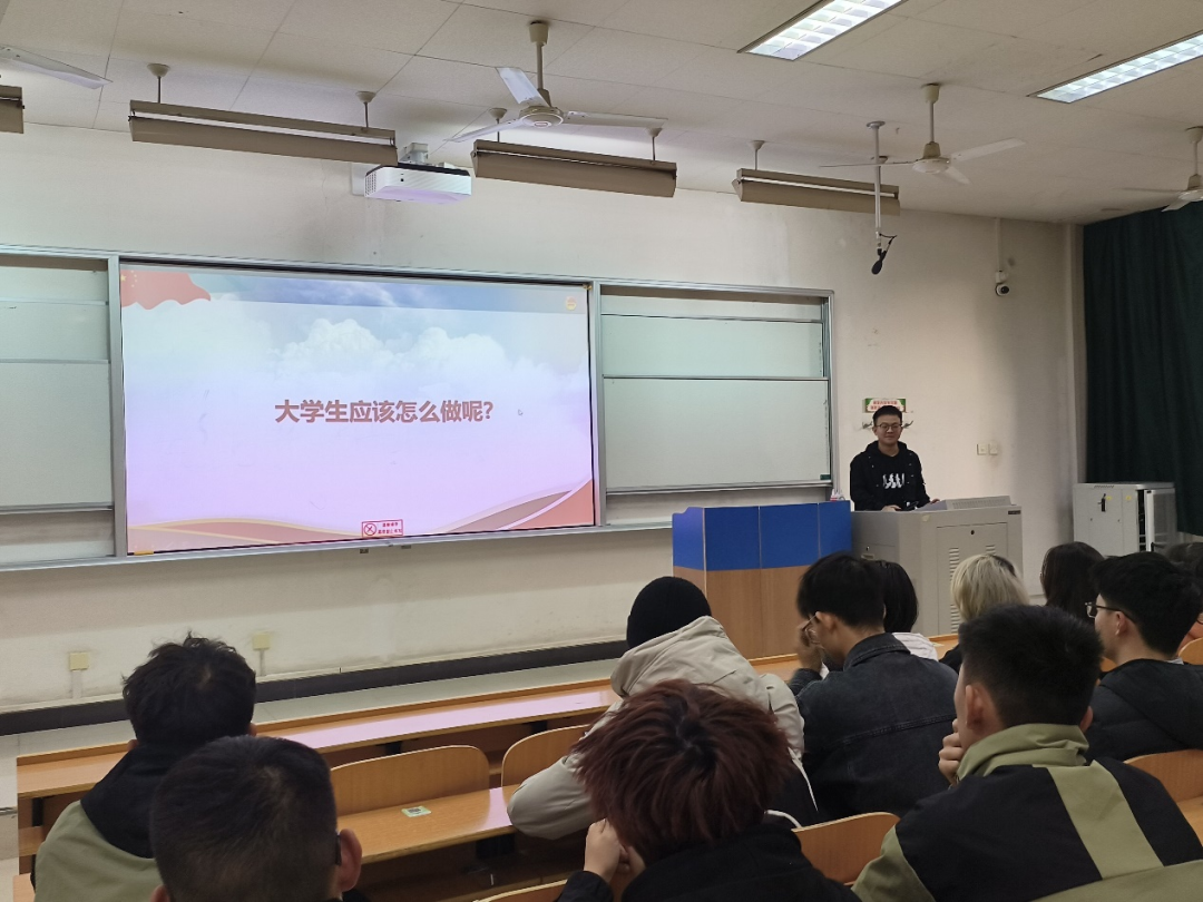 会议伊始,主持人分四个模块向大家简单介绍了主题内容,引起同学们的学习兴趣;接着,主持人带领大家一起进行了详细的学习,并展开了激烈的讨论;最后,主持人以一个问题作结,并邀请了团员吴坤向大家分享想法,吴坤同学以篮球赛为例,指大家指出“团结、拼搏、突破、奔跑”等的重要性,受到同学们一致认同。
