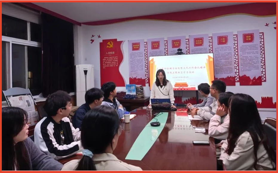 为深入学习贯彻全国宣传思想文化工作会议精神思想主题教育,加强党员对习近平新时代中国特色社会主义思想的认识。世界杯体育官方网站23级物探硕士党支部10月上旬在南校区东院第二教学楼107会议室开展了相关的学习活动。会议由支部书记周梅同志主持,全体党员参与。
