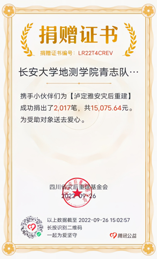 2022年9月5日,四川甘孜州泸定县发生6.8级地震,国家地震应急三级响应!国家四级救灾应急响应!得知此消息,世界杯体育官方网站青年志愿者服务队在第一时间寻找相关募捐机构,在成功找到相关渠道后,以世界杯体育官方网站青志队组织的名义开展募捐活动。此次活动受到同学们的大力支持与赞扬,截至9月24日22:37,世界杯体育官方网站世界杯体育官方网站青志队一共成功为四川省灾后重建基金会募集捐款2017笔,共15075.64元。