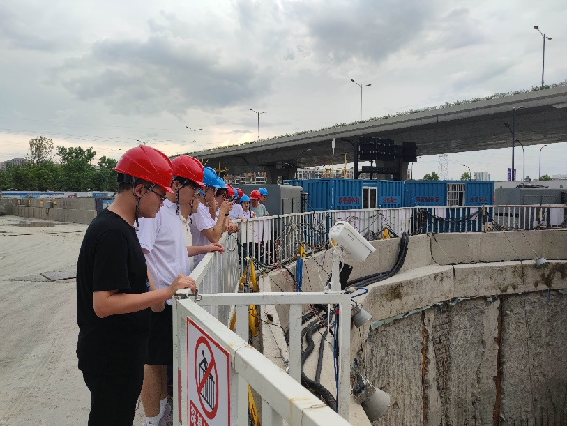 在项目介绍结束后,石经理、边副经理和汪总工带领实践队员来到施工现场,向同学们展示了顶管法所用的钻头,观摩了现场正在进行施工的顶管工作现场。