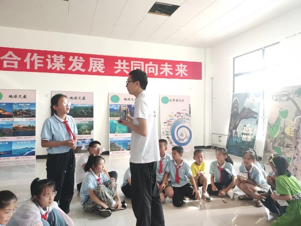 本次实践展板内容分为“认识地球”和“水的科普”两部分,主要由暑期社会实践队七名队员负责讲解。在讲解过程中,为了提高同学们的积极性,帮助小朋友们更好的理解拓展的科学知识,讲解员们设置了趣味小问题,鼓励同学们用自己的语言组织答案,并给表现突出的同学奖励铅笔、本子、棒棒糖等小奖品。
