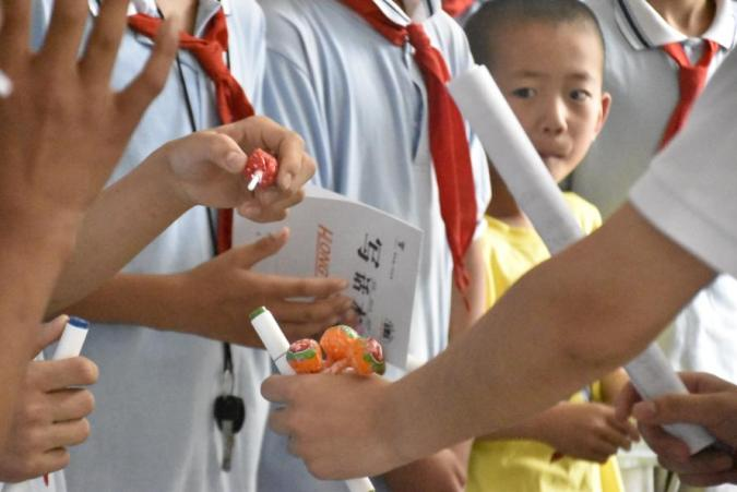 实践队队员刘岩用简单的话语,用生动有趣的授课方式,带动同学们做实验的积极性。实验过程中,实践队队员为实验完成效果好和积极主动回答问题的同学发放奖励,鼓励同学们积极发言、敢于动手,在同学们心中种下一颗科学的种子,激发他们探究科学知识真理的兴趣。