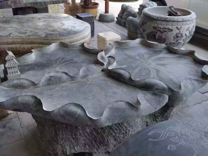 富平石刻分布极广,其中尤以宫里石刻最为闻名,实践队来到宫里镇建材石刻业工会联合会,工会负责人非常热情地欢迎队员们。负责人向队员们介绍了石刻厂的主要营业范围,以及主要特色,其雕刻产品主要有牌楼,砚台,护栏,柱鼎等。选材主要以该县乔山山脉的墨玉石为主,拥有得天独厚的地域优势。随后,负责人带领实践队参观厂内的雕刻成品,这些成品雕工精细,形式多样,栩栩如生,其制作之精美深深吸引了实践队员。