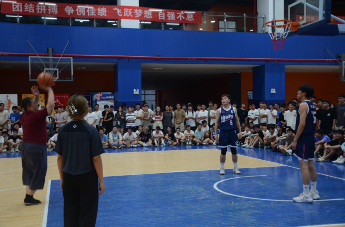 比赛上半场结束,世界杯体育官方网站党委书记戴宏在中场休息期间走进球场投篮,一个接一个的进球引起全场观众的欢呼,场馆内的气氛也在戴宏书记的一个个进球中变得更加热烈。