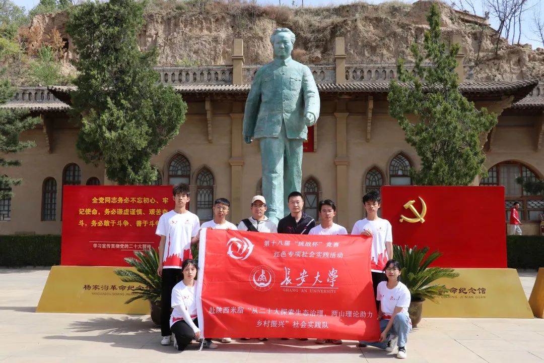 上午9时,实践队成员来到杨家沟革命旧址探寻米脂县红色精神的气息。在此,实践队员学习到了“十二月会议”的重要意义,了解了杨家沟在中共党史和中国革命史上的重要地位。在讲解员的引领下,实践队队员依次走过“十二月会议”旧址、主要参会人员住处及毛泽东主席等主要领导人的住址——新院,了解到十二月会议是在中国革命战争的历史转折关头召开的一次具有重大意义的会议。此次会议所制定的政治、经济纲领比《新民主主义论》和《论联合政府》中提出的纲领有了进一步的发展。更为难得的是,在毛泽东主席的塑像下,实践队成员遇到了五位来自延安的新中国第一代讲解员,在与他们的交流中,实践队成员们更加真切地感受到了老一辈革命人对祖国赤诚的爱,对红色文化有了更进一步的感悟。