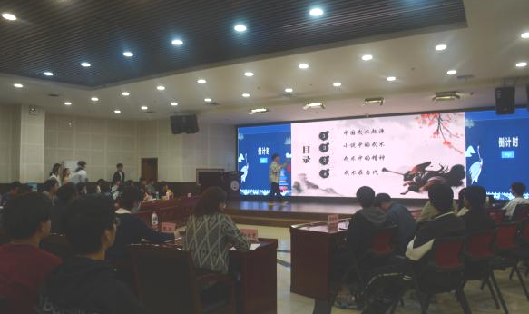 比赛伊始,主持人龙博炜、张莎莎介绍了决赛赛制。本次活动于2022年10月拉开帷幕,共有50多支队伍,近300人参加比赛,经过激烈角逐,共有8支队伍脱颖而出,入围决赛。本次决赛共分为三轮。第一轮为传统文化展示环节,各个队伍通过PPT展示了各种中国传统文化知识,有戏曲、武术、节日和姓氏等等;第二轮为传统文化知识快答环节,选手们从容不迫地答出一道又一道正常答案,赢得阵阵掌声;第三轮为传统文化问答盲盒环节,选手可在答题正确后选择是否继续答题。