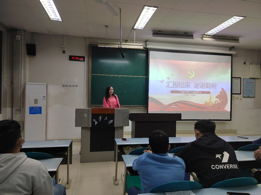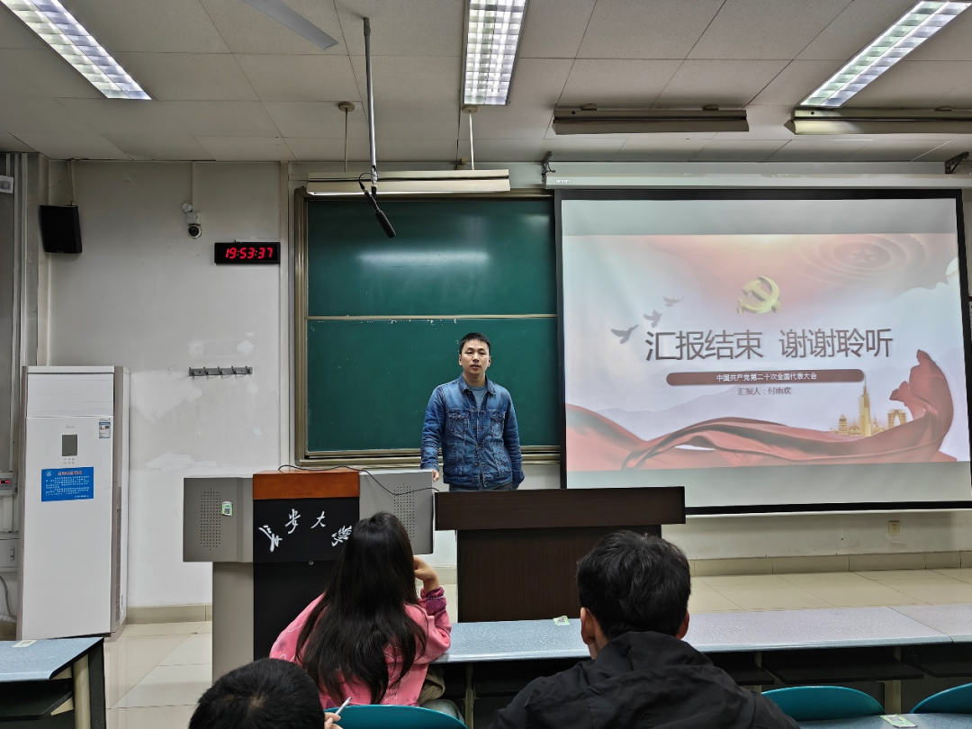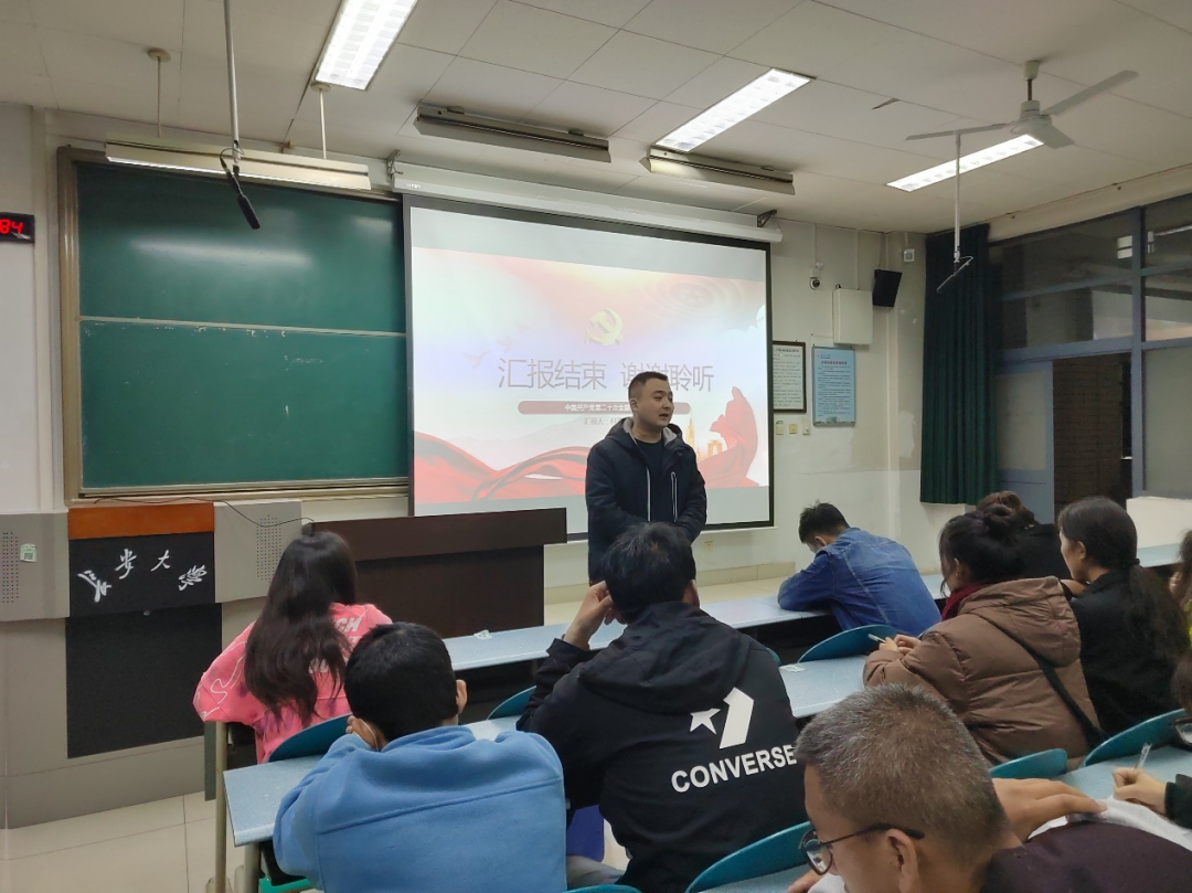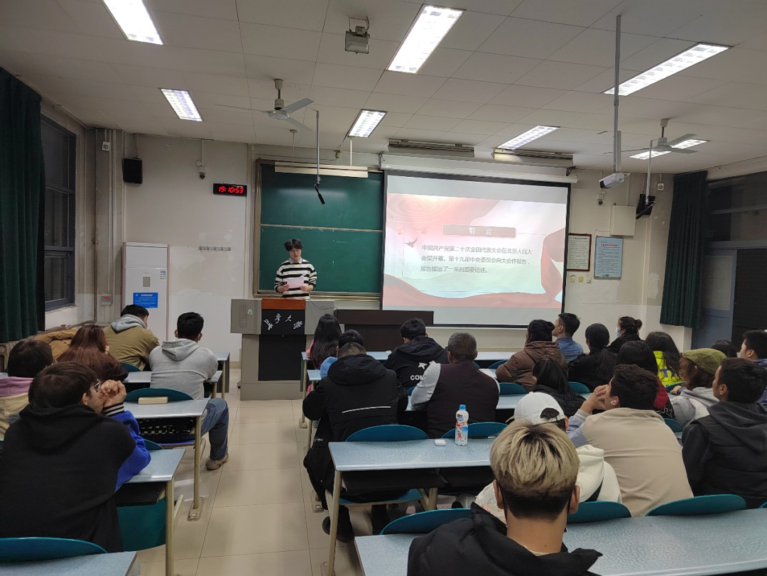 会议伊始,付雨欢同学首先进行了党的二十大精神宣讲,他用通俗易懂的语言,结合大学生学习生活实际,从党的二十大主要成果、中国式现代化等方面对党的二十大精神作了深入讲解和深刻阐释,与同学们分享了自己的学习感悟和领会。