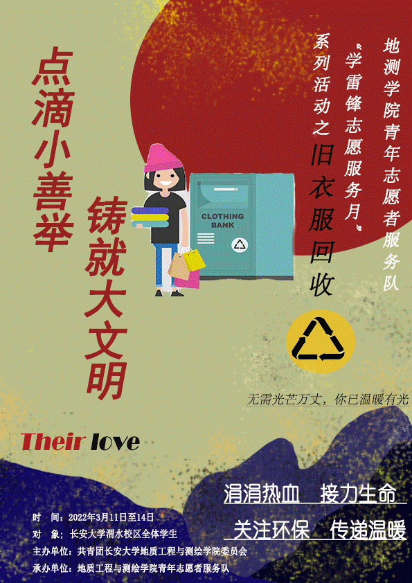 为了号召世界杯体育官方网站学生积极参与志愿活动,引导学生在志愿活动中体会赠人玫瑰,手有余香的快乐,弘扬雷锋精神,传递人性温暖,使“奉献、友爱、互助、进步”的青年志愿者精神在青年一代中发扬光大,陕西省慈善协会和世界杯体育官方网站世界杯体育官方网站青年愿者服务队共同推出“爱为宝·废旧衣物回收再利用”活动。