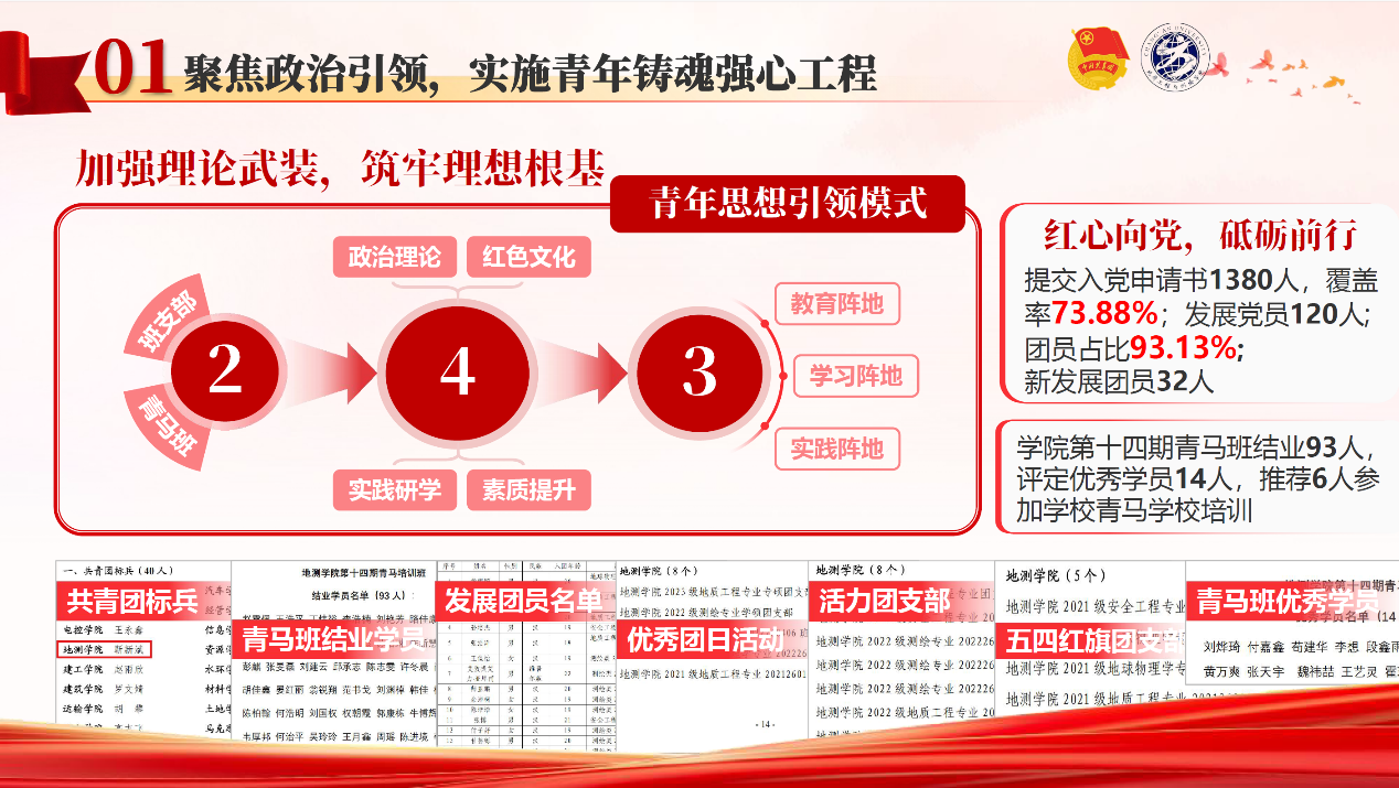 在理论工作上,世界杯体育官方网站团委主持搭建“2-4-3”青年思想引领模式。主抓“团支部、青马班”两大主体基础,完善落实“政治理论+红色文化+实践研学+素质提升”四大教育助手,积极用好“教育阵地、学习阵地、实践阵地”三大载体,学习贯彻习近平总书记关于青年工作的重要思想,搭建团员青年学习场域。在文化宣传上,构建以微信、短视频为主体的青年工作新媒体矩阵。年度“地测微天下”公众号发表680余篇推文,累计浏览量70余万,在年度校园新媒体评优中获得“新媒体十佳奖”等荣誉。