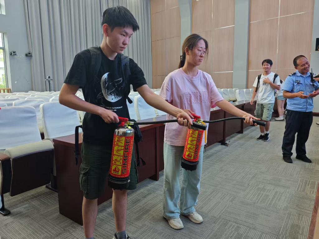 讲座结束后,师生参与消防灭火实操演练。保卫处消防科王永平、孙德斌老师详细讲解了不同灭火器的使用场景、操作流程及注意事项,并指导师生进行实战演练。通过亲手操作灭火器,参与师生不仅掌握了灭火技能,更增强了应对突发火情的信心与能力。