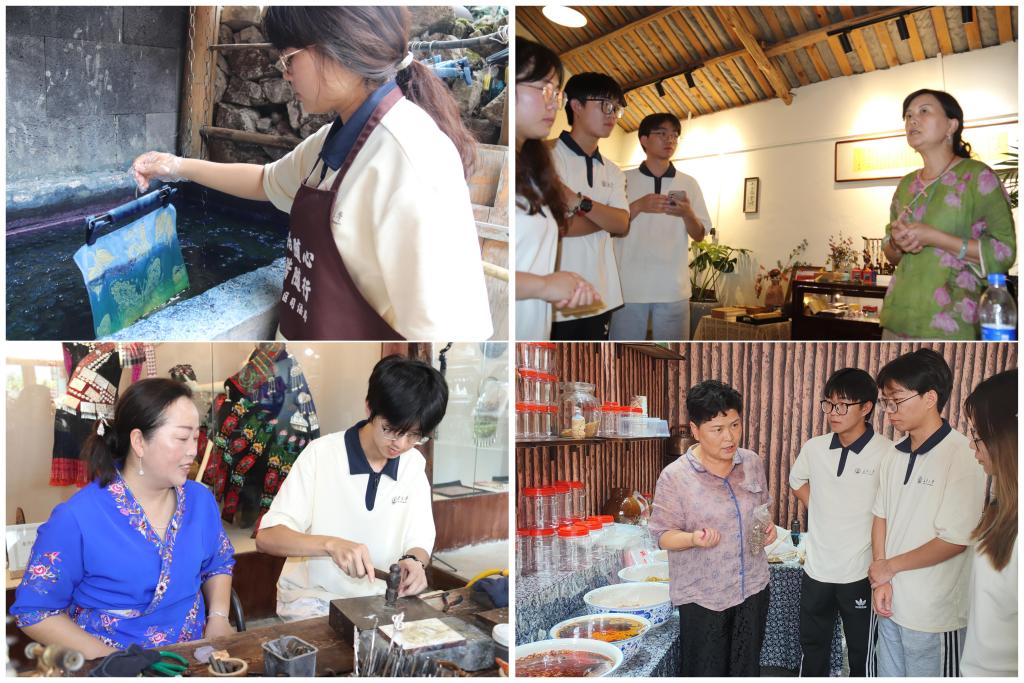 在刺梨酿酒坊,队员们全程记录31道工艺、108个环节的匠心坚守,品味承载布依族待客文化的醇香佳酿;于辣坊现场,见证传统晒腌剁封技艺与现代电商深度融合,解码非遗产品日销千单的产业密码;在国家级非遗传承人张谨的银坊,锻打签刻的铿锵声中,体悟“让老手艺在新时代扎根”的坚守与创新;步入染坊,“民族团结主题长卷”的共创模式生动诠释多民族“技艺共传、产业共兴”的发展理念。队员们认识到:这些工坊正通过非遗技艺的创造性转化,构建“文化传承-价值提升-人才回归”的内生循环,为乡村振兴注入持久动能。