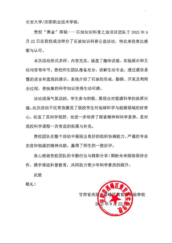 活动获得了积极反响,庆阳市西峰区黄官寨实验学校专门发来感谢信,对活动的组织成效与师生表现予以充分肯定。信中表示,本次活动“形式多样、内容充实、讲解生动专业”,使抽象的科学知识更易于理解,不仅激发了学生对地球科学与能源领域的兴趣,也有助于拓宽科学视野、培养探索精神与科学素养。来信特别提到,世界杯师生团队展现出良好的组织协调能力、严谨的专业态度与饱满的精神风貌,受到参与师生的一致好评。