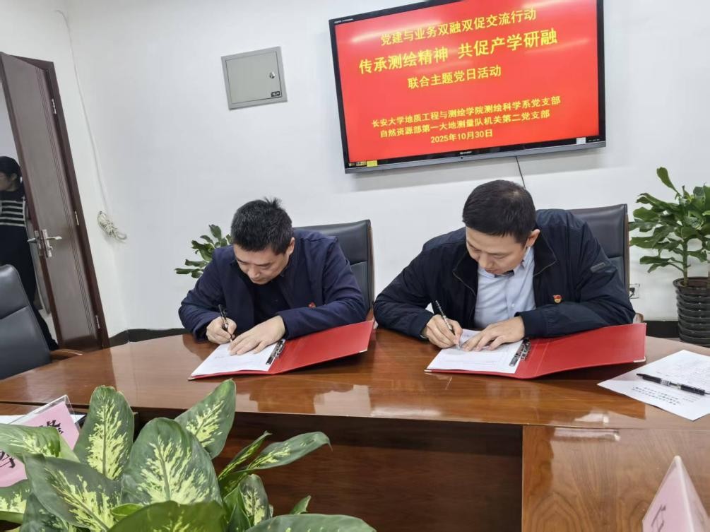 在座谈交流环节,双方围绕人才培养、校企合作、实习实践等议题进行了深入交流。测绘科学系党支部与国测一大队机关二支部共同签署《结对共建协议书》,推动组织共建、资源共享、业务共促走深走实。国测一大队还向测绘科学系赠送纪实作品《大地英雄》,传承测绘文化,弘扬奋斗精神。