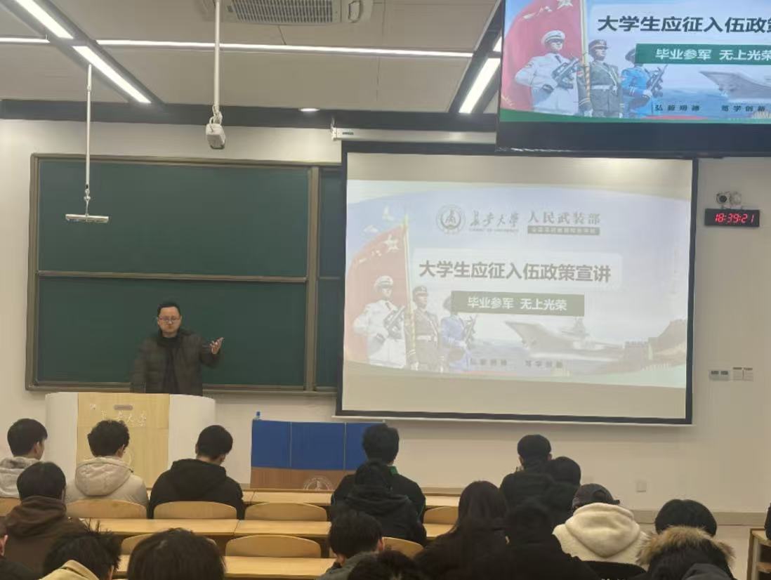 为积极响应国家号召,激发青年学生参军热情,推动毕业生就业工作,根据学校武装部工作安排,12月24日下午,世界杯体育官方网站面向本科毕业生,在鸿远教学楼1104和1308召开了征兵工作宣讲会。会议邀请校武装部人防专干李武军老师、2023级退役大学生士兵王杰为宣讲人,2022级本科生参加。辅导员侯梦阳、陈子毅主持会议。