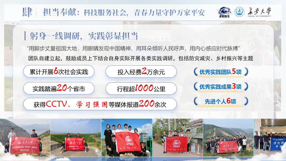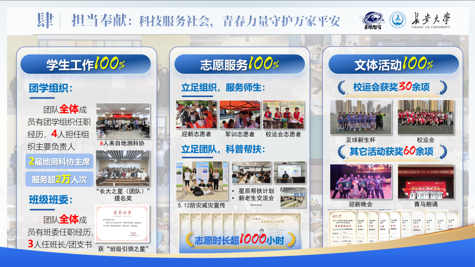 成员实现学生工作、志愿服务与文体活动全员参与。核心成员接任学院科协执行主席,志愿活动累计时长超1000小时……从实验室到边坡现场,从技术研发到防灾宣传,团队用行动书写着“顶天立地”的青春答卷,用成果回应着“星域智哨”的使命担当。