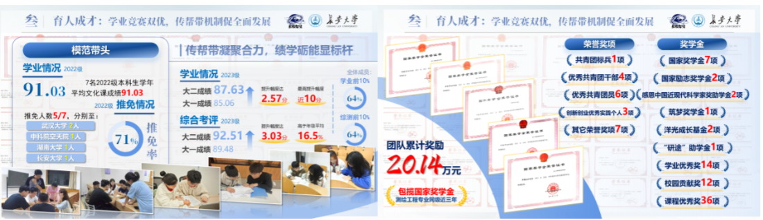 团队成员学业成绩优异,初创团队7人学年平均文化课成绩达91.03分,5人推免至武汉大学等顶尖学府,包揽测绘工程专业同级近三年全部国家奖学金。在“传帮带”机制下,23级成员平均成绩提升2.57分,最高提升近10分。团队累计奖励超20万元。
