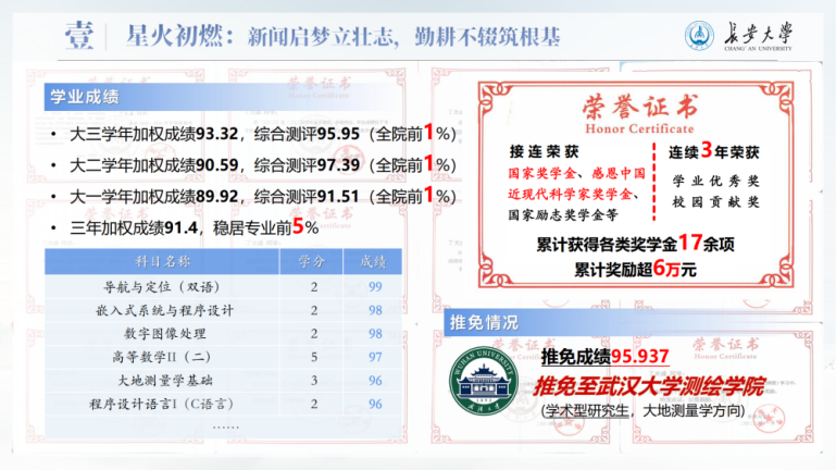 进入世界杯体育官方网站后,他珍惜来之不易的求学机会,借助生源地助学贷款完成学业,也把全部热情投入到学习中。大三学年,他的加权成绩达到93.32,综合测评95.95,位列学院前1%,先后获得国家奖学金、感恩中国近现代科学家奖学金等各类奖学金17项,累计金额6万余元,并成功推免至武汉大学继续深造。