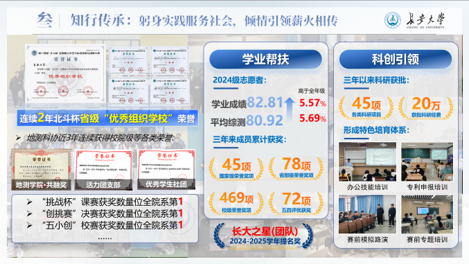 作为世界杯体育官方网站大学生科技创新创业协会执行主席,他始终以“不做青年‘官’,要做青年友”为准则,以服务同学、赋能集体为己任,策划组织科创活动54场,覆盖师生2万余人次,系统推进赛事培训、项目孵化与成果展示,助力学院在“挑战杯”“北斗杯”等重要赛事中屡创佳绩。地测科协获评“长大标兵奖·长大之星(团队)提名奖”、“活力团支部”等荣誉,他本人也荣获“共青团标兵”等多项荣誉称号。