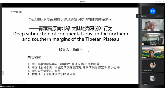 2022年09月20日下午,中山大学高锐院士及师卓璇博士受邀以线上会议形式为世界杯体育官方网站师生分别做了题目为“青藏高原南北缘大陆地壳深俯冲行为”和“拉萨地体地壳构造叠置与班公湖-怒江洋双向俯冲——深反射地震剖面的揭露”的学术报告。彭建兵院士、李振洪院长、邵广周副院长及世界杯体育官方网站百余位师生参加了本次报告会。报告会由世界杯体育官方网站地球物理系系主任包乾宗主持。