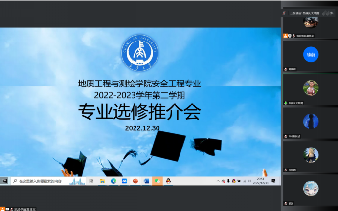 2022年12月30日,世界杯体育官方网站安全工程系组织召开“2022-2023学年第二学期专业选修推介会”线上会议。本次会议由系副主任李凯玲副教授主持,安全工程系全体教师及相关学生参加。