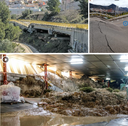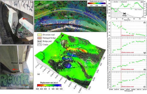 2022年4月初,西班牙东南部Alcoy市连续强降雨,诱发了该市圣地亚哥公园区大型滑坡出现多次局部滑动,摧毁一座桥梁、威胁多座居民楼和一个工厂的安全(如图2)。在该滑坡发生前的10个月,世界杯张勤教授研究团队与西班牙阿利坎特Roberto Tomás教授团队合作,利用合成孔径雷达干涉测量技术(InSAR),采用德国TerraSAR-X与西班牙PAZ雷达数据对西班牙Alcoy全市进行了地质灾害早期识别与动态监测,成功探测出41个地质灾害隐患点,结合现场调查划定了三个滑坡高风险区(图3),并对风险区采用InSAR技术进行了动态跟踪监测,最终成功捕获到异常形变现象(图4)。相关研究成果在滑坡发生前多次提交给Alcoy市政管理部门,有效指导该滑坡灾害的管理及防灾减灾工作,避免了人员伤亡与经济损失。