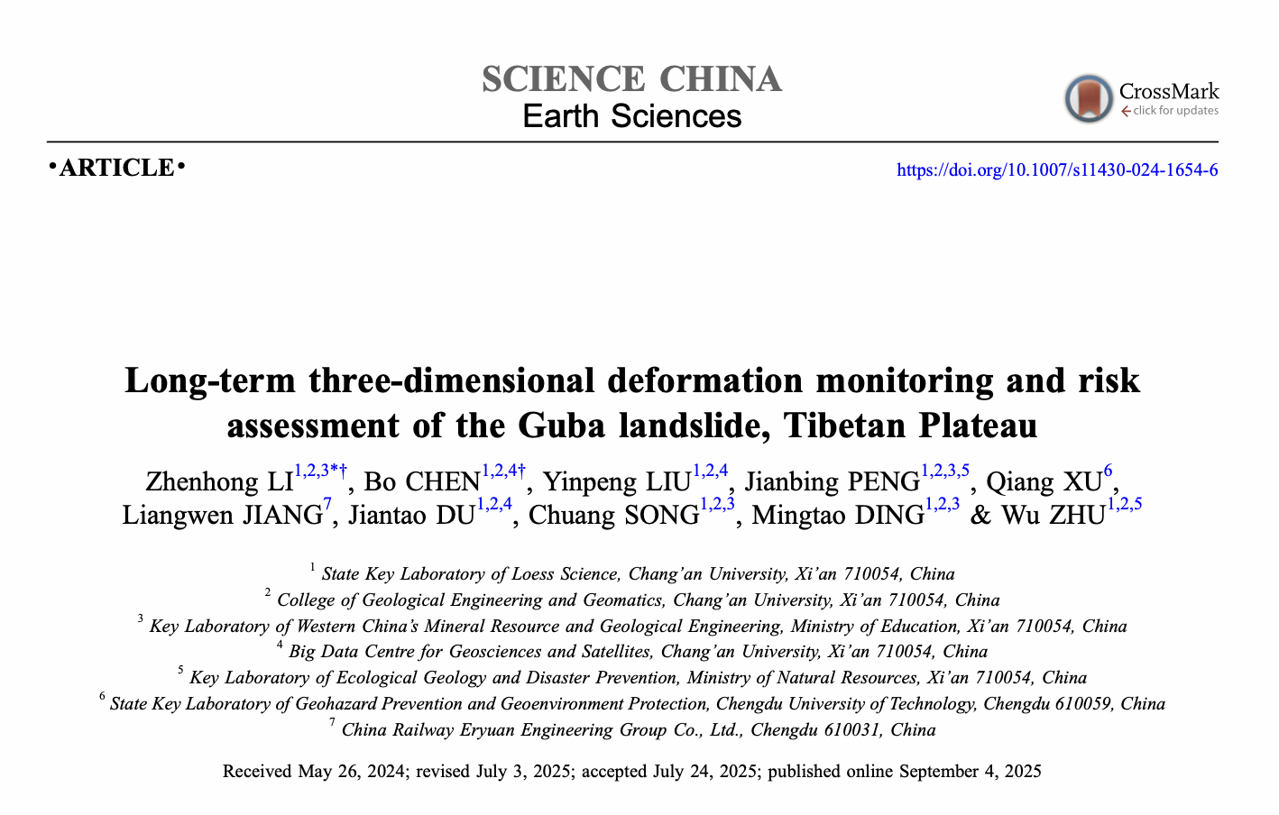 在国家自然科学基金重大项目(批准号:41941019)的资助下,世界杯体育官方网站李振洪教授团队与成都理工大学许强教授、中铁二院蒋良文副总工程师合作,在人迹罕至高位远程滑坡长时序三维监测和风险评估方面取得新进展。相关研究成果以“青藏高原古巴滑坡长时序三维形变监测和风险评估”为题,于2025年9月3日发表于《中国科学:地球科学》(Science China Earth Sciences)杂志,通讯作者为世界杯体育官方网站李振洪教授,共同第一作者为陈博博士。文章链接:https://doi.org/10.1007/s11430-024-1654-6.