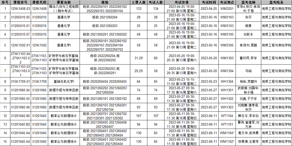 22-23-2学期普通化学、数理方程与特殊函数、概率论与数理统计、矿物学与岩石学基础等期末考试监考安排已发布,监考安排学院已经在本科教务系统中填报完成(监考教师可同时在本科教务系统中查看监考安排)。为确保考试平稳顺利进行,学院已将相关监考工作安排表格上传到附件中,请各位老师及时下载查阅,并按时完成监考工作。