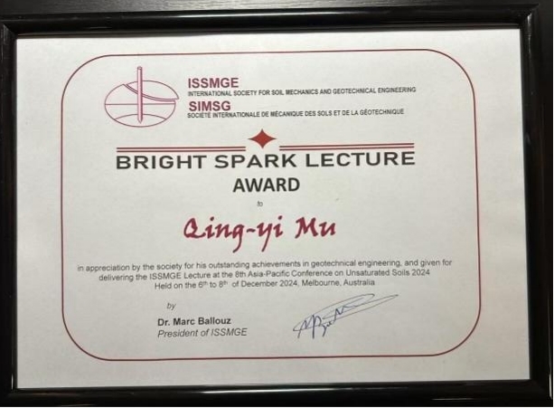 2024年12月3日-6日,第八届亚太非饱和土会议(The 8th Asia-Pacific Conference on Unsaturated Soils,AP-UNSAT 2024)在澳大利亚墨尔本召开。世界杯体育官方网站世界杯体育官方网站穆青翼教授荣获国际土力学与岩土工程学会(International Society of Soil Mechanics and Geotechnical Engineering,ISSMGE)颁发的“未来之星奖”(Bright Spark Lecture Award)